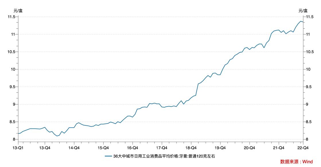 近几年,牙膏价格的确在持续上涨。据Wind数据,2013年至今,中国牙膏价格整体保持上升走势,尤其是2018以来,涨幅更为明显。截至2022年10月,120克左右普通牙膏均价为11.35元/盒,较2018年同期的9.09元/盒上涨约25%。而2018年至2021年以及2022年10月,CPI同比涨幅分别为2.10%、2.90%、2.50%、0.9%、2.10%,物价整体平稳。